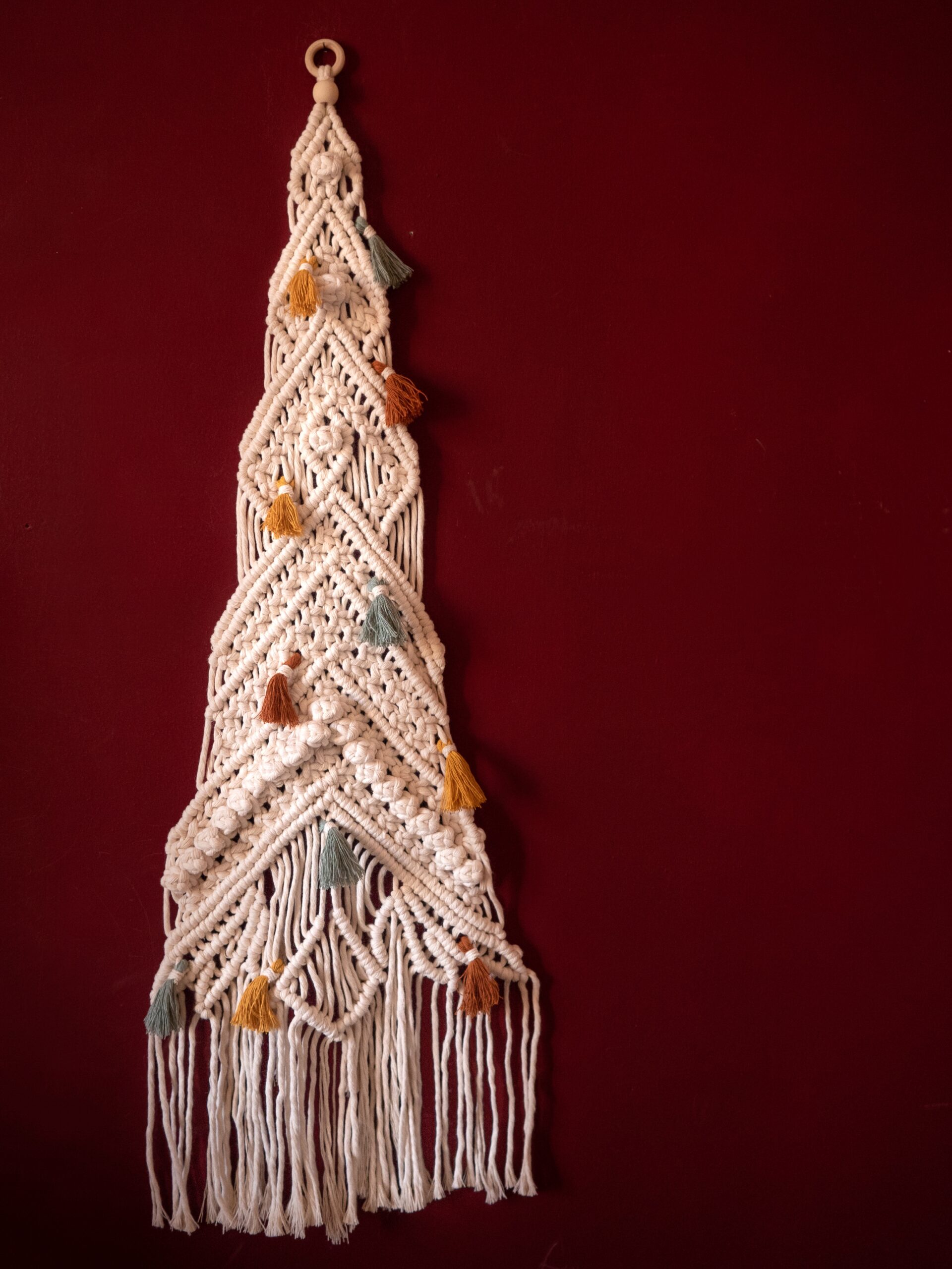 Albero di Natale in macrame realizzato a mano con materiali naturali. E’ perfetto per arredare la casa con lo spirito natalizio in stile bohemian, ma anche per regalare qualcosa di unico a una tua persona cara. Scegli l’artigianato per i tuoi pensieri di natale, regalando queste creazioni in macrame fatto a mano, con amore e passione.