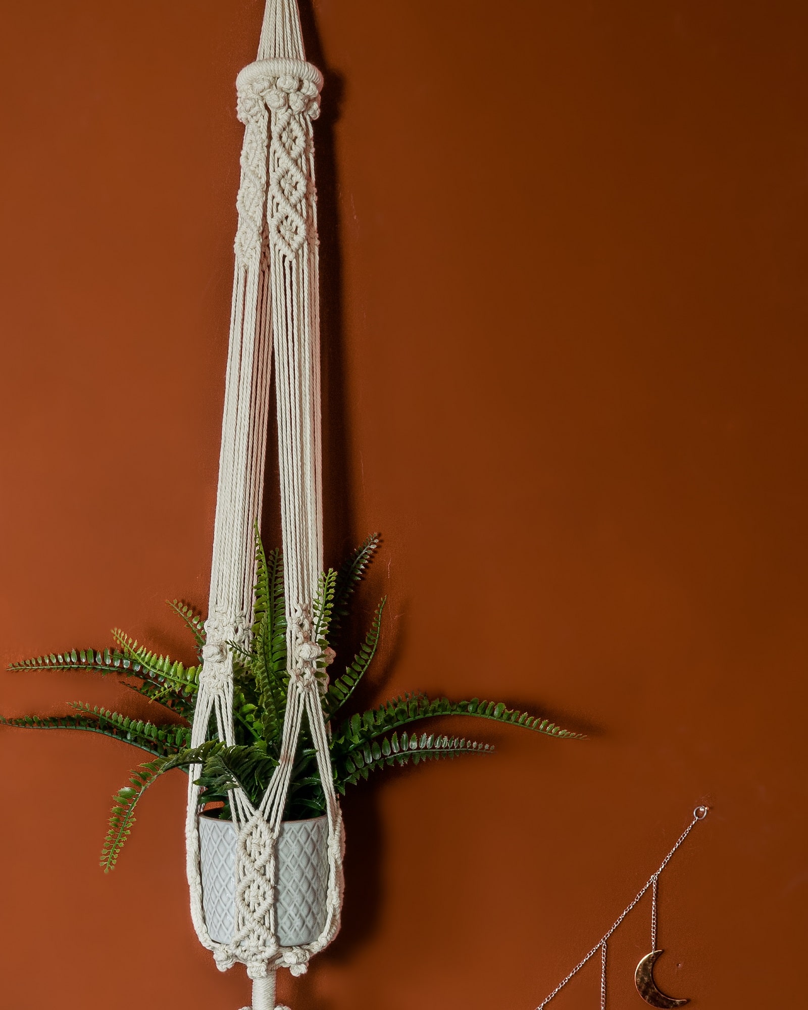 Portavasi in macrame fatto a mano in cotone di alta qualità ideale per vasi fino a circa 20cm di diametro. Dai un tocco Boho al tuo arredamento con questo portavasi in macrame realizzato per sorreggere le tue piante preferite. E’ facile da installare e molto resistente grazie alla corda intrecciata da 4mm.