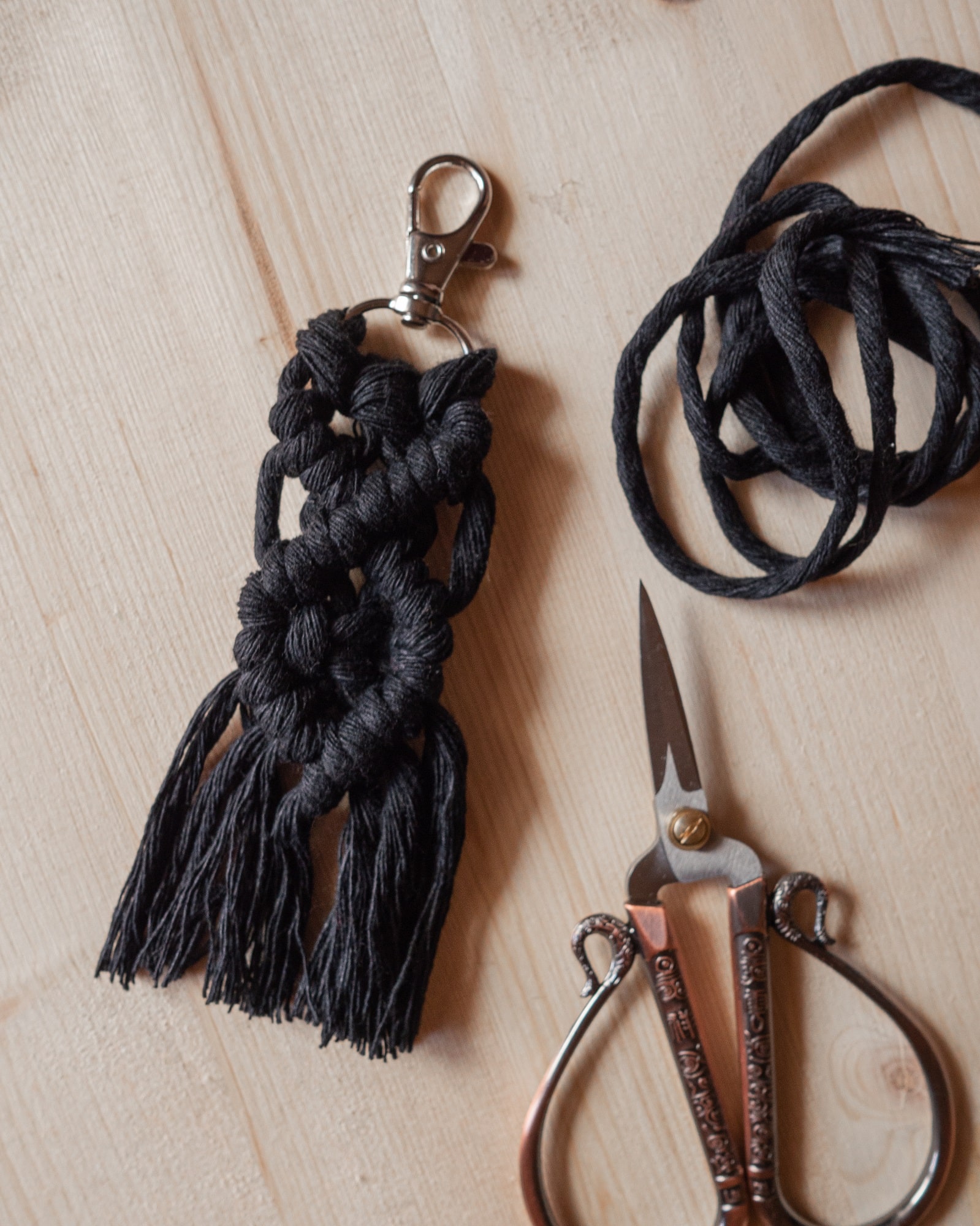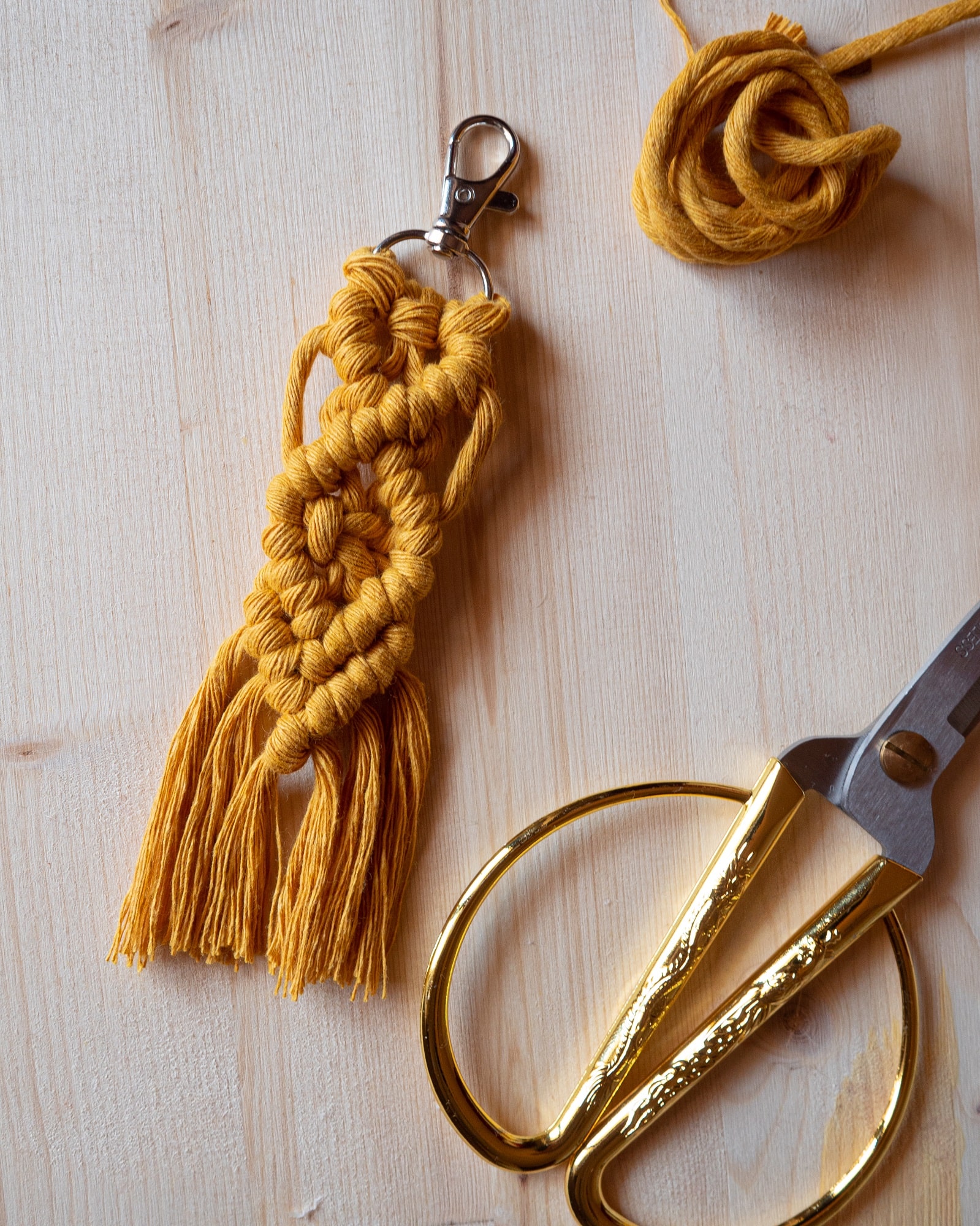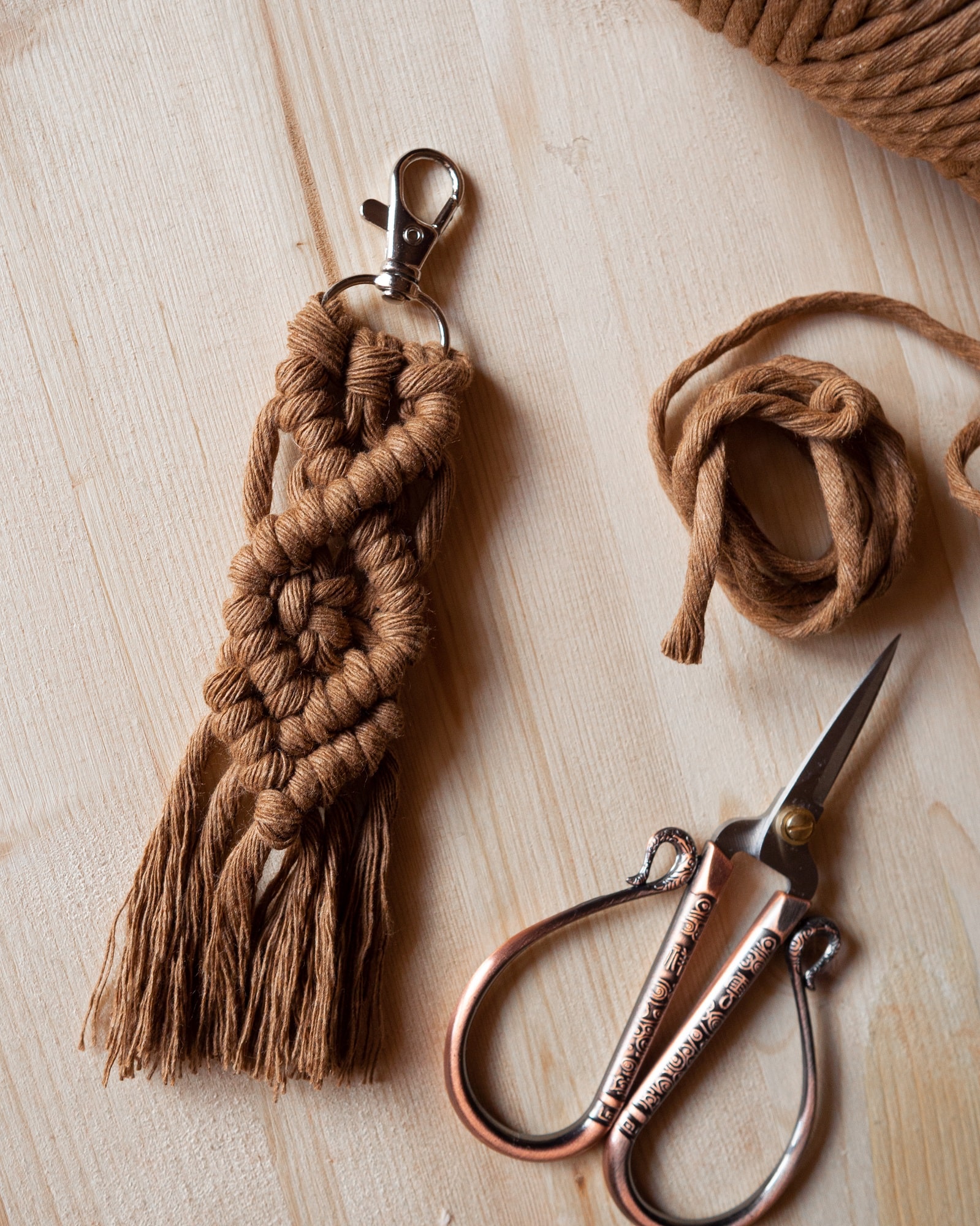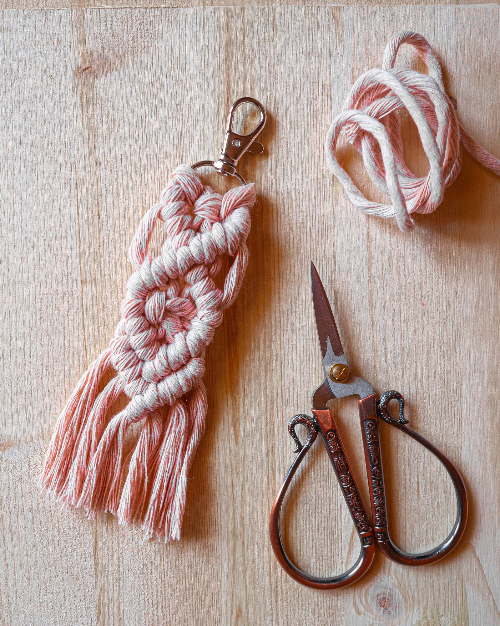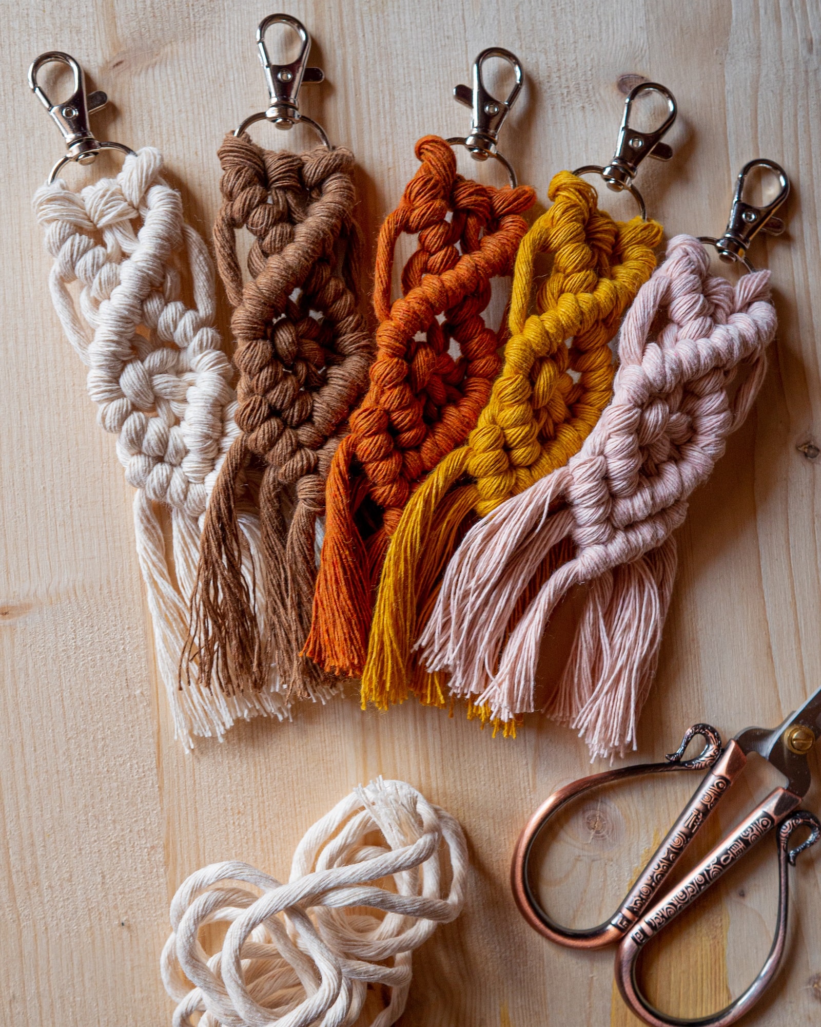 Portachiavi in macrame realizzato a mano disponibile in diverse colorazioni.