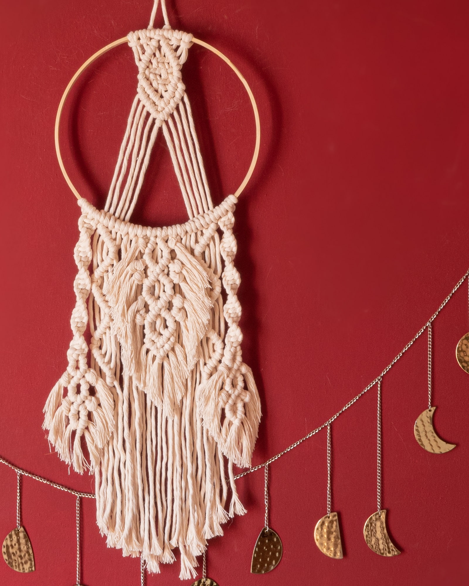 Questa creazione in macrame nasce come acchiappasogni ed è realizzata a mano con filo di cotone naturale, e come ogni acchiappasogni ha le piume per dare leggerezza nella notte.