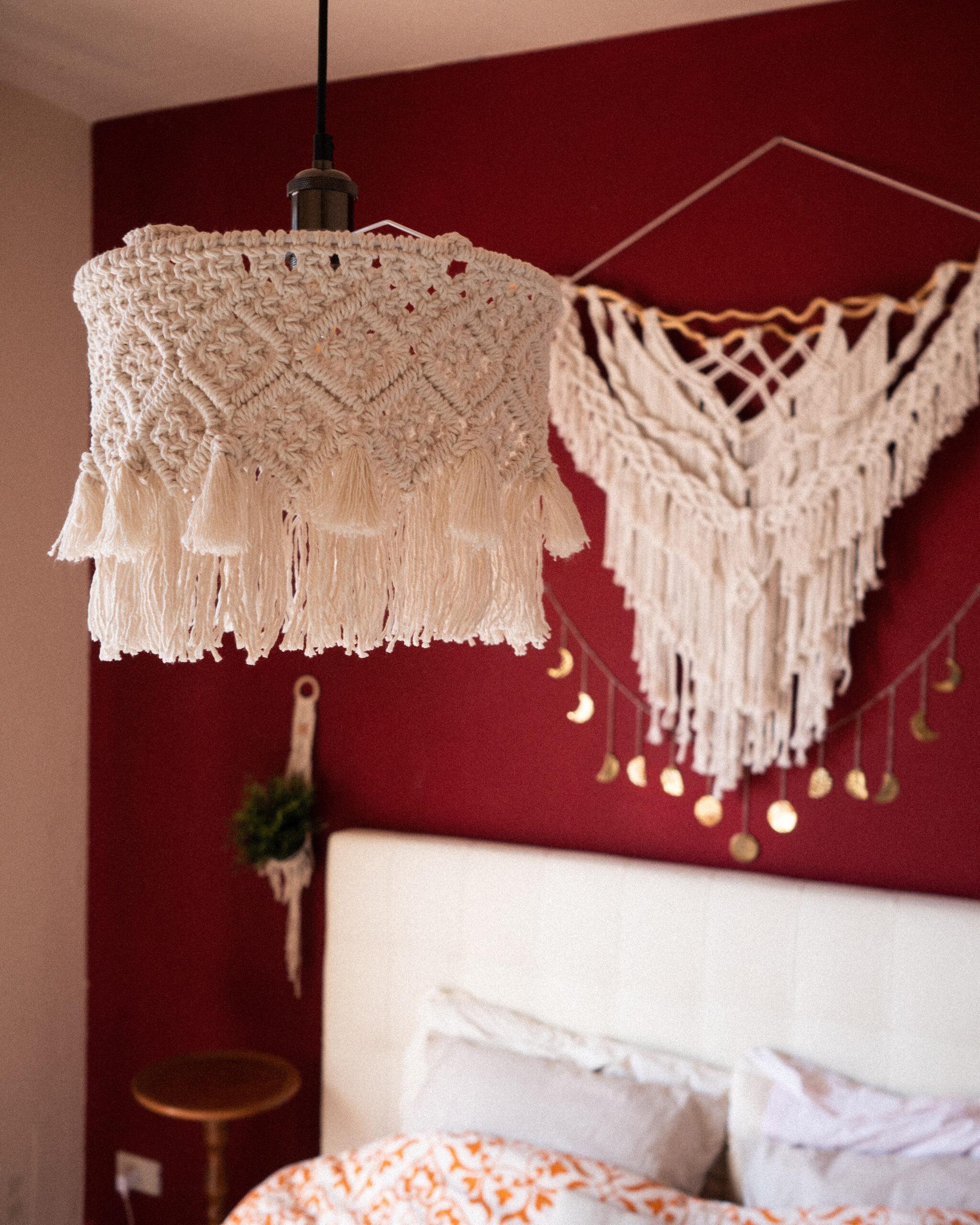 Lampadario di macrame realizzato a mano con prodotti naturali.